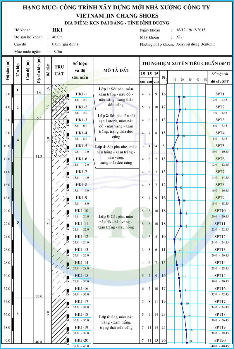 Công tác khoan khảo sát địa chất “CÔNG TRÌNH XÂY DỰNG MỚI NHÀ XƯỞNG CÔNG TY VIETNAM JIN CHANG SHOES” đã được đội khoan khảo sát địa chất Công ty TNHH Tư Vấn Xây Dựng 146 thực hiện ngoài hiện trường từ ngày 17/12/2015 đến ngày 25/12/2015 bằng máy khoan cố định, bơm rửa bằng dung dịch sét bentonit và thí nghiệm trong phòng từ 26/12 đến 30/12/2015.
