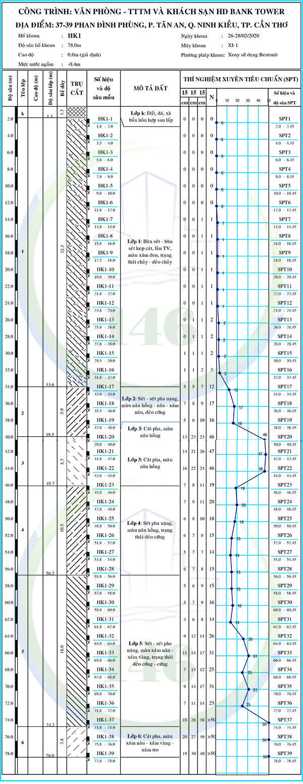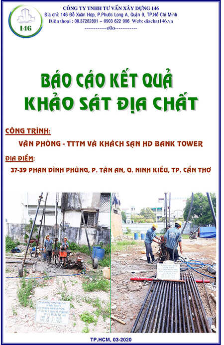 Công tác khoan khảo sát địa chất công trình “VĂN PHÒNG – TTTM VÀ KHÁCH SẠN HD BANK TOWER” đã được đội khoan khảo sát địa chất Công ty TNHH Tư Vấn Xây Dựng 146 thực hiện ngoài hiện trường từ ngày 26/02/2020 đến ngày 04/03/2020 bằng máy khoan cố định, bơm rửa bằng dung dịch sét bentonit và thí nghiệm trong phòng từ 02/03/2020 đến 18/03/2020.
